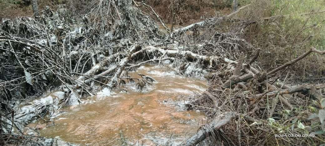 Sungai yang diduga tercemar akibat tumpahan minyak dari pipa Pertamina yang bocor di Desa Suka Damai Kabupaten Pali. (Foto: Dok. Kawali).